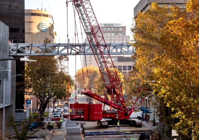 This past week, construction crews began hoisting into place a sky bridge that will link Adobe’s newest tower to the original campus. The San Jose based tech campus has been under construction as Adobe expands its downtown footprint. The bridge will cross over West San Fernando Street and connect the new Adobe North Tower with the existing 3-building campus.