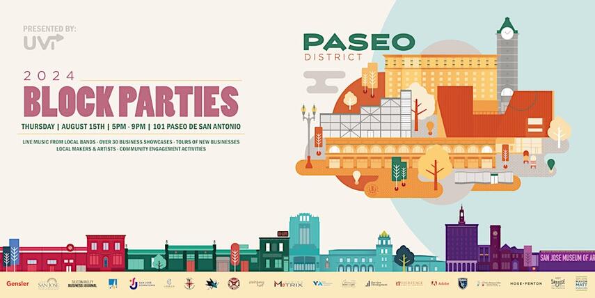 Mark your calendars for Thursday, August 15th, from 5 PM to 9 PM, and head over to San Jose’s Paseo De San Antonio District for an unforgettable evening! The Urban Vibrancy Institute is kicking off its Block Party series with live music, delicious food and drinks, and an exciting showcase of over 30 local businesses. Discover new spots with guided tours, meet local makers and artists, and enjoy a night of community and celebration. Don’t miss out—come connect with your neighbors and support local businesses!